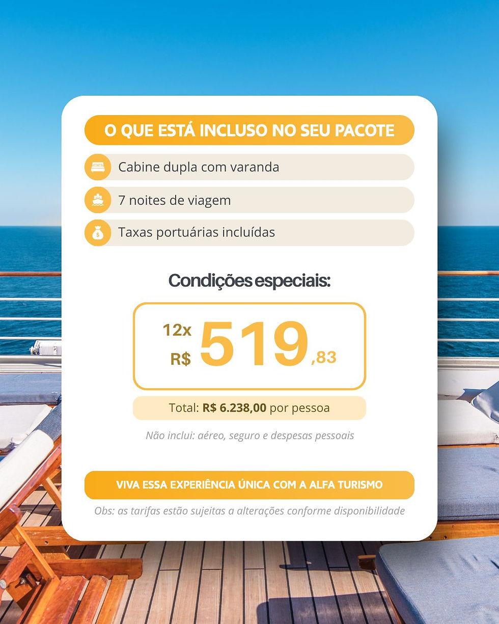 7 noites de viagem a bordo do navio Costa Diadema, em cabine dupla com varanda, com todas as refeições inclusas (café da manhã, almoço, jantar e lanches), além de shows, espetáculos, academia, piscinas e taxas portuárias já inclusas.